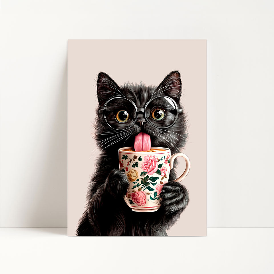 Step into a whimsical world where a quirky black cat, wearing hilarious human-like glasses, savours a steaming cup of coffee from a mug adorned with botanical floral patterns with this captivating kitchen print. Ideal for cat enthusiasts and coffee lovers alike, this cat illustration exudes charm and humour, making it a perfect addition to your home decor or a delightful gift for a cat owner. This funny print, blending feline grace with a caffeine kick, is guaranteed to bring a touch of joy to any kitchen or dining room. Embrace a touch of maximalist flair with this trendy cat poster that promises to enliven your space with its unique character. Whether adorning your kitchen or cloakroom wall, this playful cat wall art is sure to spark conversations and add a dash of personality to your surroundings. Elevate your space with this amusing and stylish piece that captures the essence of a purr-fect coffee moment.