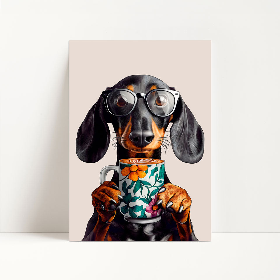 Introducing the adorable Sausage Dog Drinking Coffee Print, a whimsical delight for any dog lover’s space. This charming dog illustration features a playful sausage dog wearing hilarious reading glasses and holding a botanical floral mug of coffee, adding a quirky and humorous twist to your decor.