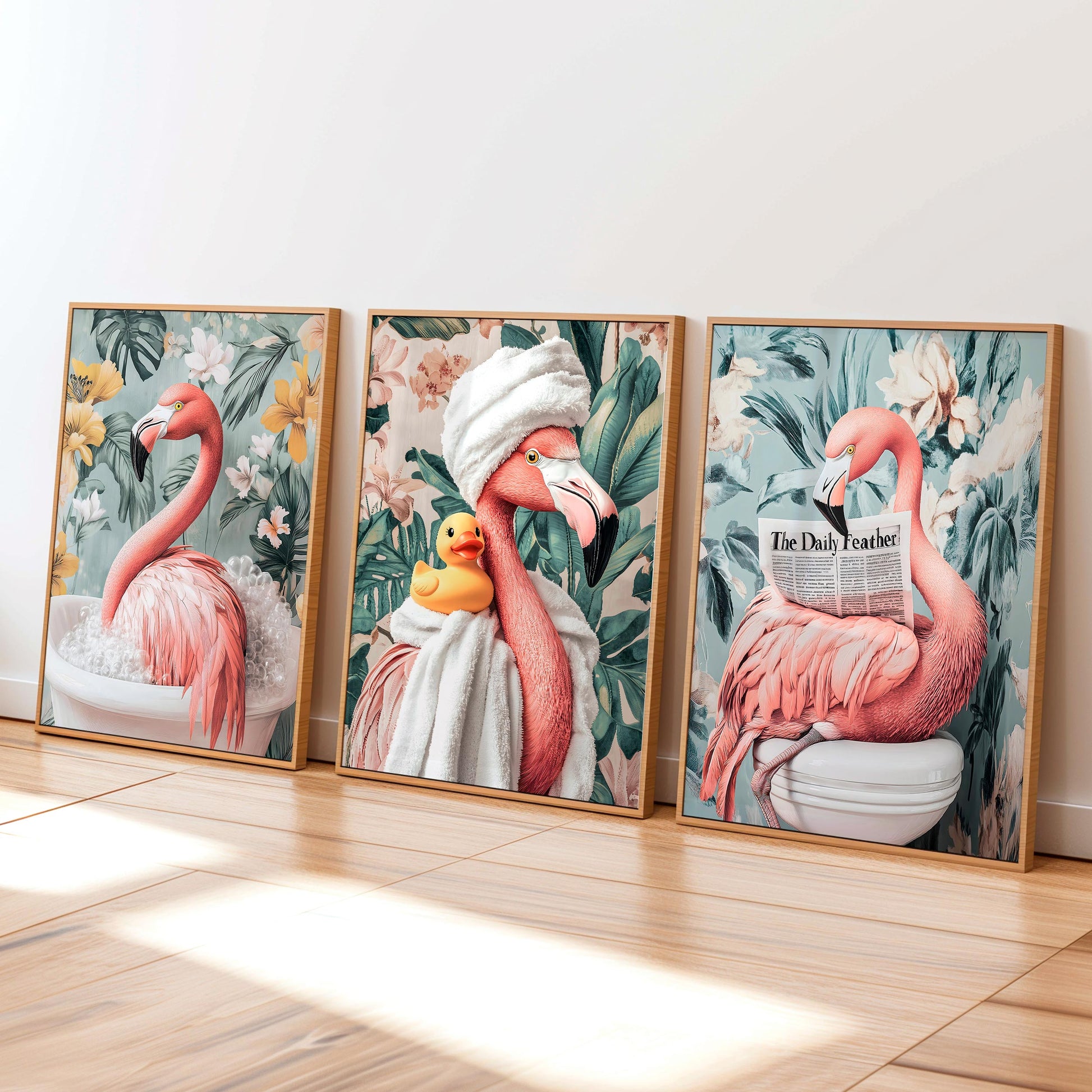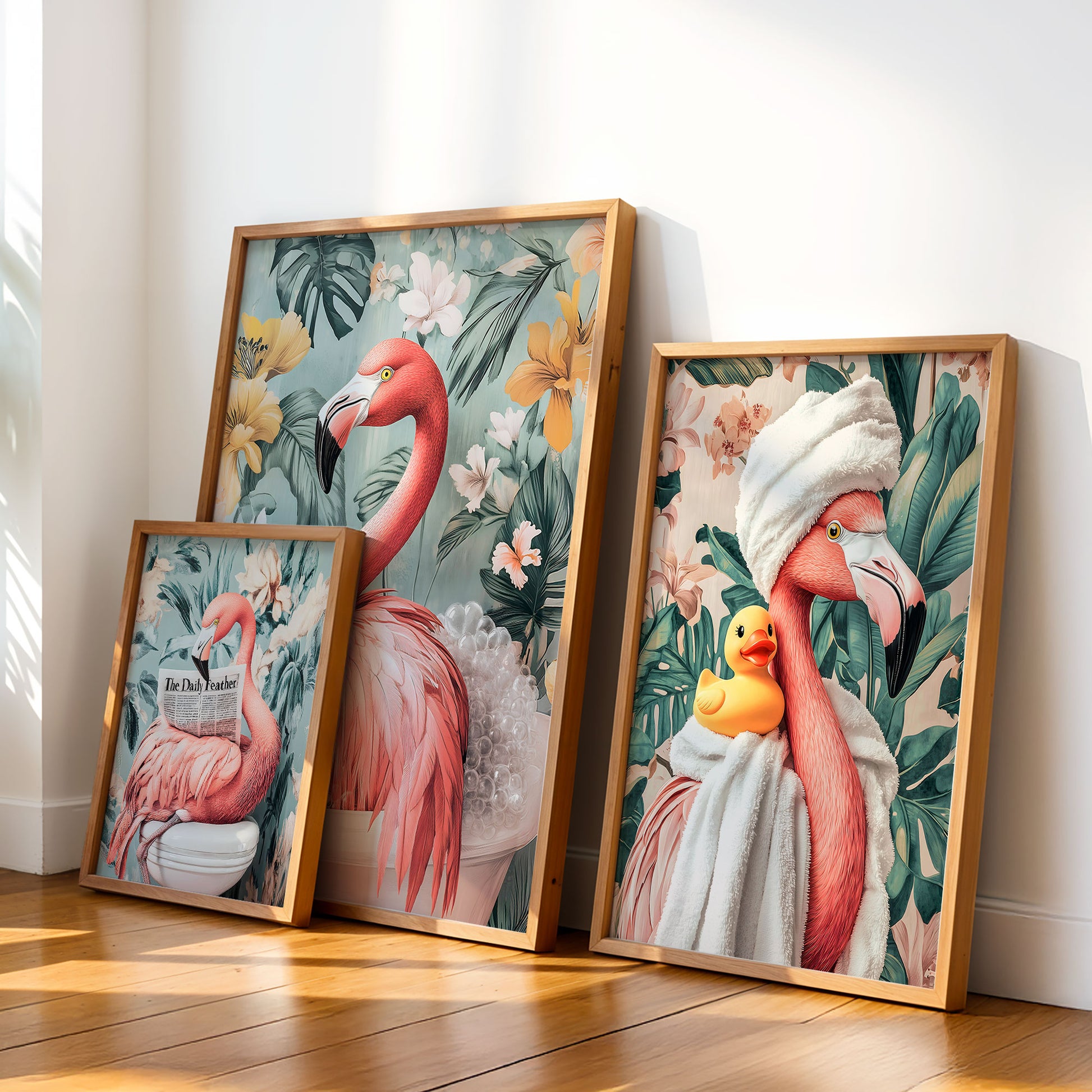 Set of 3 Flamingo Bathroom Wall Art Prints