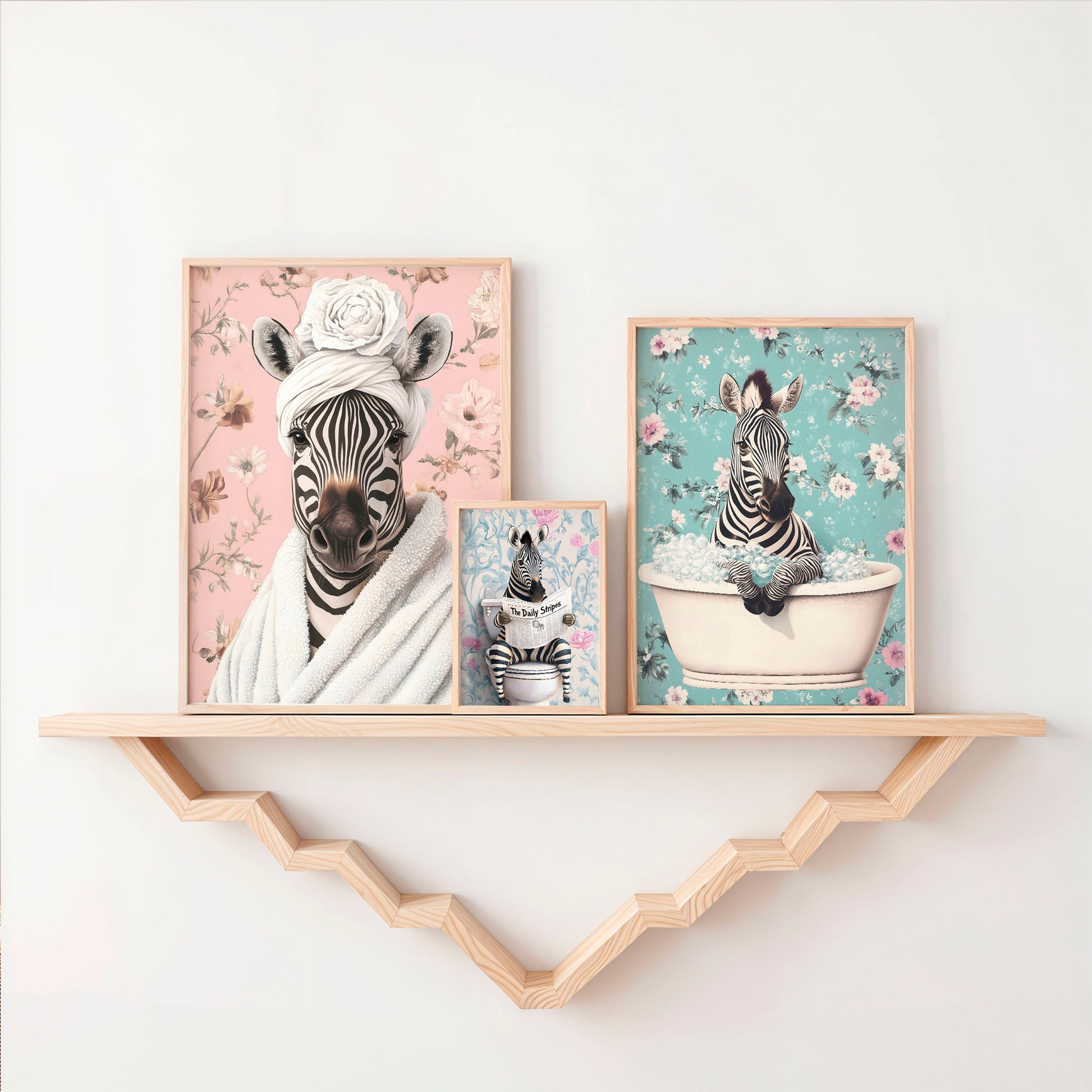 Transform your bathroom into a whimsical oasis with this charming set of 3 Funny Zebra Bathroom Wall Art Prints. Each print features a lovable Zebra in various hilarious scenarios – from a giraffe on the toilet reading a newspaper to one lounging in a robe and another relaxing in the bath. These maximalist prints from Dopamine Decor are not only a delightful addition to your decor but also a conversation starter. Perfect for those who appreciate quirky and funny gifts, these botanical bathroom prints add a touch of humour to any space. Elevate your toilet art decor with this unique collection and bring a giggle to your daily routine.