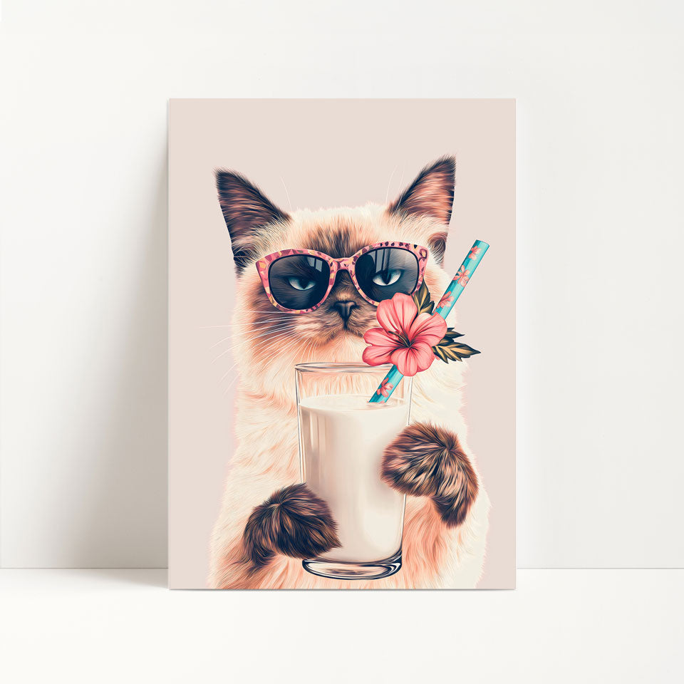 Step into a whimsical world where feline charm meets kitchen chic with our Siamese Cat Drinking Milk Kitchen Print. Featuring a cat with quirky floral glasses and a hilarious deadpan expression, this delightful illustration combines playful artistry with a touch of humour, making it the purrfect addition to any cat owner's home.